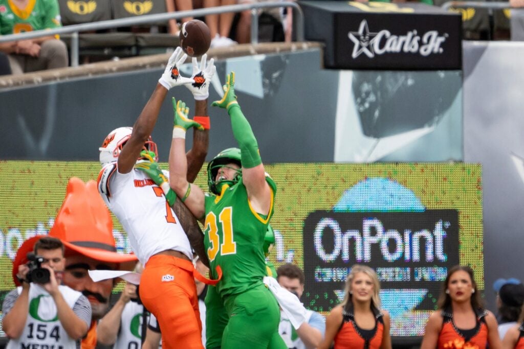 Then, he jumped into the portal and landed at Oregon. Thanks to the upgrade in talent in support, his tackle numbers fell to 86 as he prepares to play in the Peach Bowl. Even then, he added 3.5 tackles for loss, one sack, five pass breakups, and two interceptions.