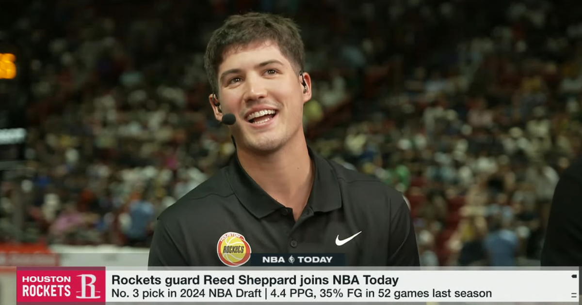 Before Rob Dillingham and Antonio Reeves faced off in the opening game of the Las Vegas Summer League on Thursday afternoon, their old Kentucky teammate, Reed Sheppard, joined ESPN’s pregame set for an interview. Sheppard, who was at the Thomas & Mack Center to support his fellow Wildcats, made his first nationally televised appearance since his Houston Rockets were a part of the NBA’s trade of the summer, adding Kevin Durant to next season’s roster and championship aspirations.