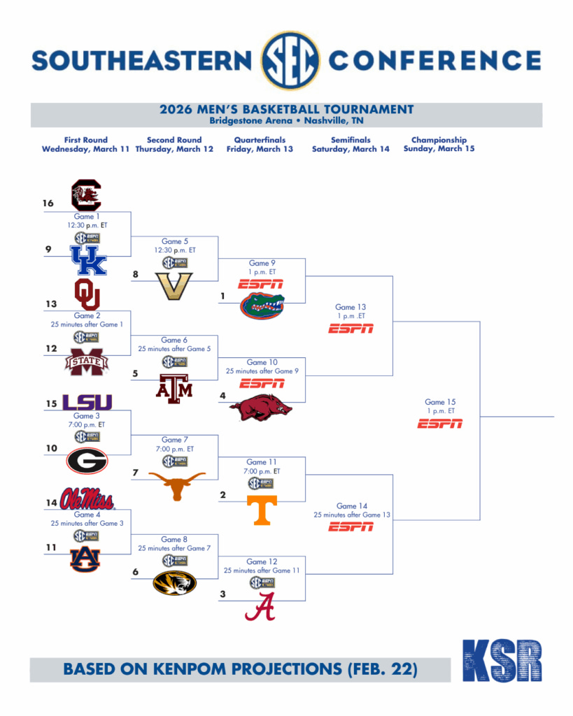 With two weeks left in the season, KSR’s SEC Tournament Bracketology used KenPom’s game predictions to project the SEC Tournament field. In this exercise, Kentucky wins one of its last four games and finishes in a four-way tie for sixth in the conference.