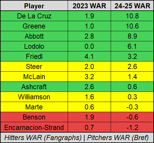 Elly De La Cruz is Elly De La Cruz. This year felt like an off year for him, playing through injuries and all that, and he still managed to put up 4.2 WAR. The only questions, at this point, are if he can rein in the errors a bit and go a full season without having an extended slump at the plate. In either case, 12.8 WAR through his age-23 season puts him on a hall-of-fame caliber track. He’s an All-Star, but is he an MVP? That’s what we get to see these next few years.