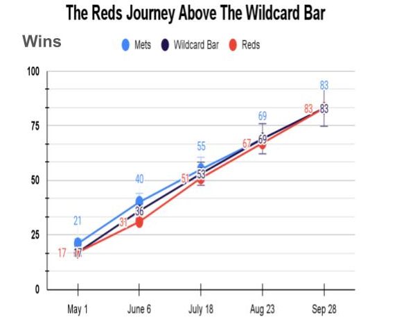 Here is a graphical look at the wildcard race showing the relative positions of the Reds and Mets to the last wild card spot, which I call the wild card bar. The waypoints here are intervals marking the Reds completion of 20% segments of their season.