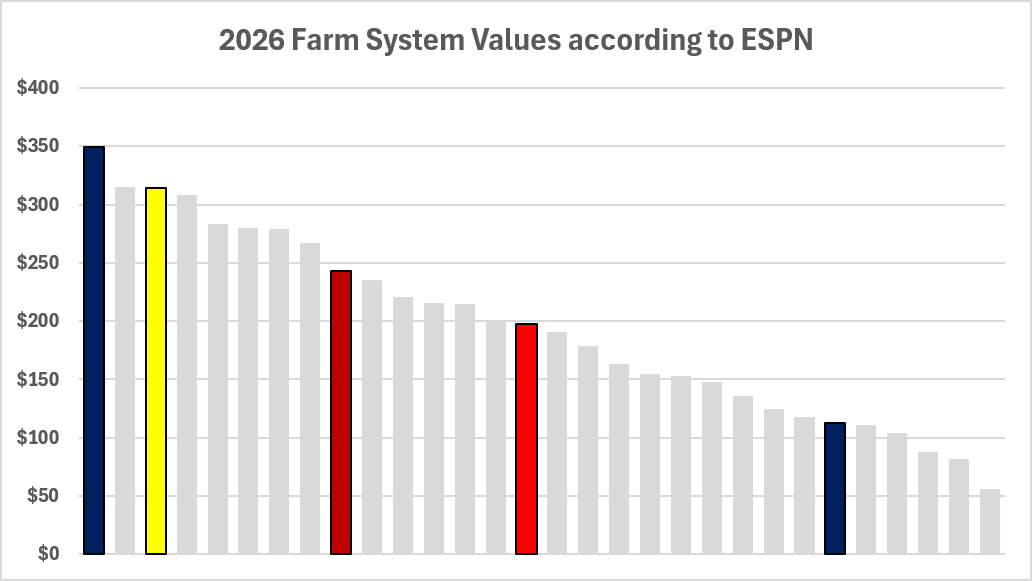 Basically all of that was to say that Cincinnati has had and still likely does have a whole lot of ground to make up against the best teams in their own division. The Reds stated plan is to build through the farm system. ESPN’s Kiley McDaniel released the 2026 Farm System rankings and the club doesn’t exactly stack up well with most of the division.